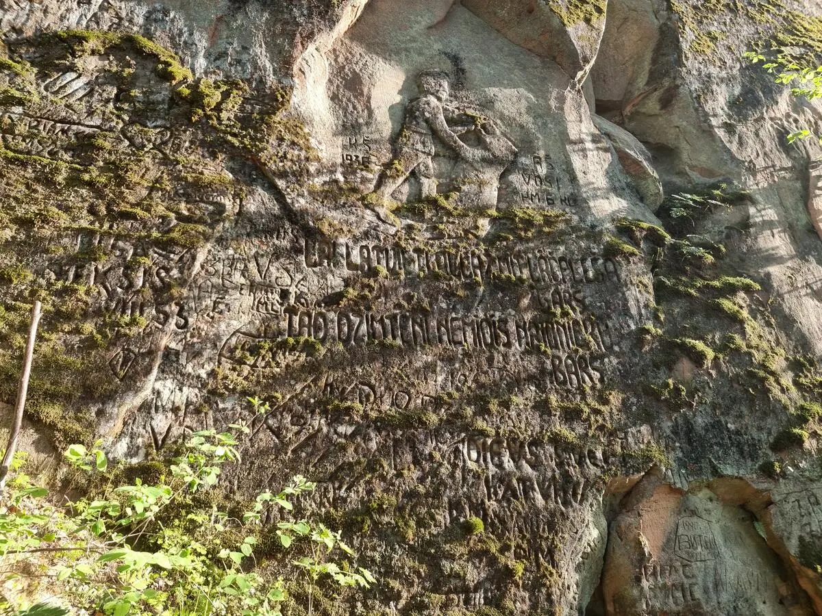 Ērģeļu klintis, 1936. (?) gadā veidots nacionālpatriotisks gravējums. 2025. gada maijs.