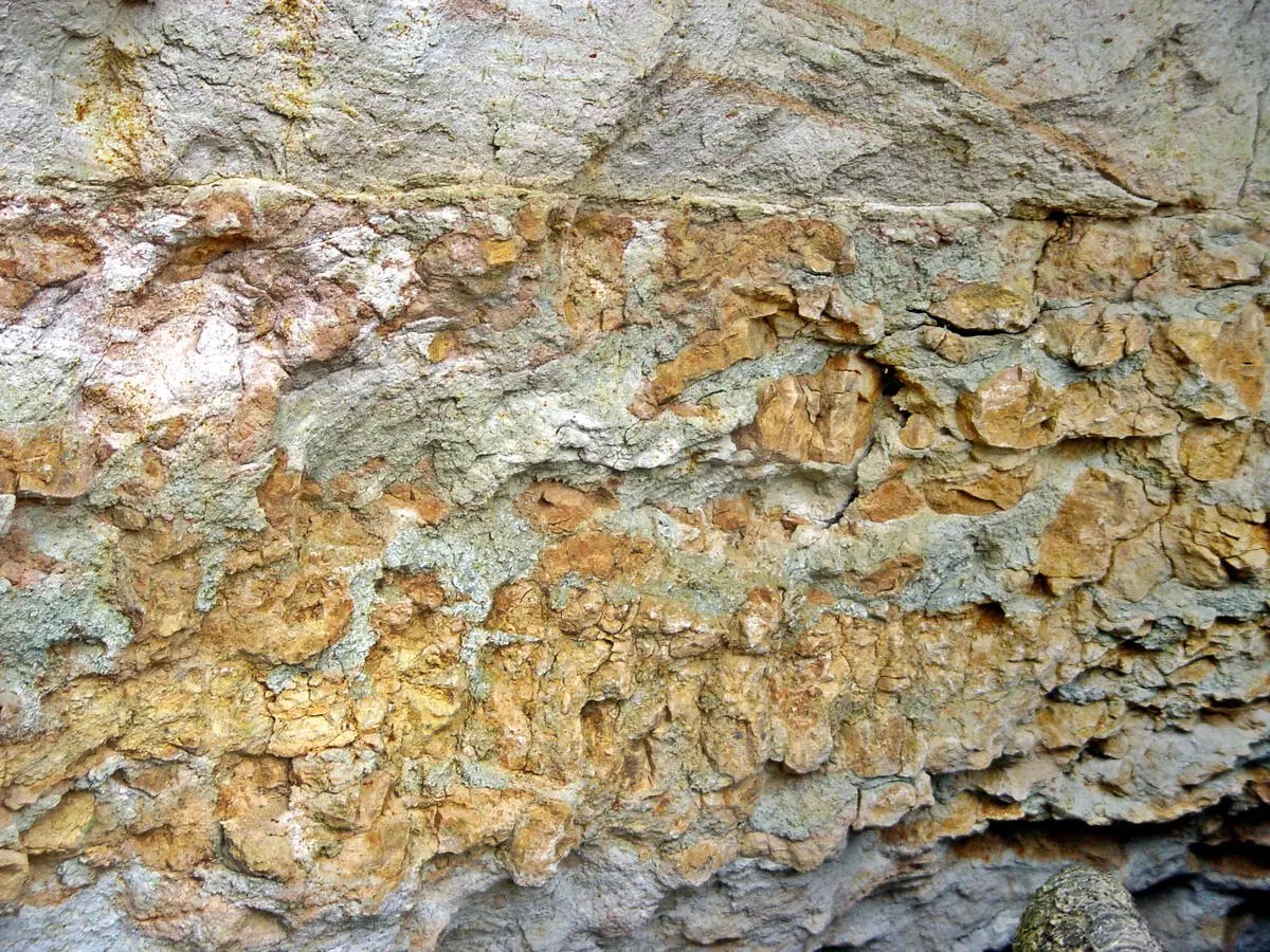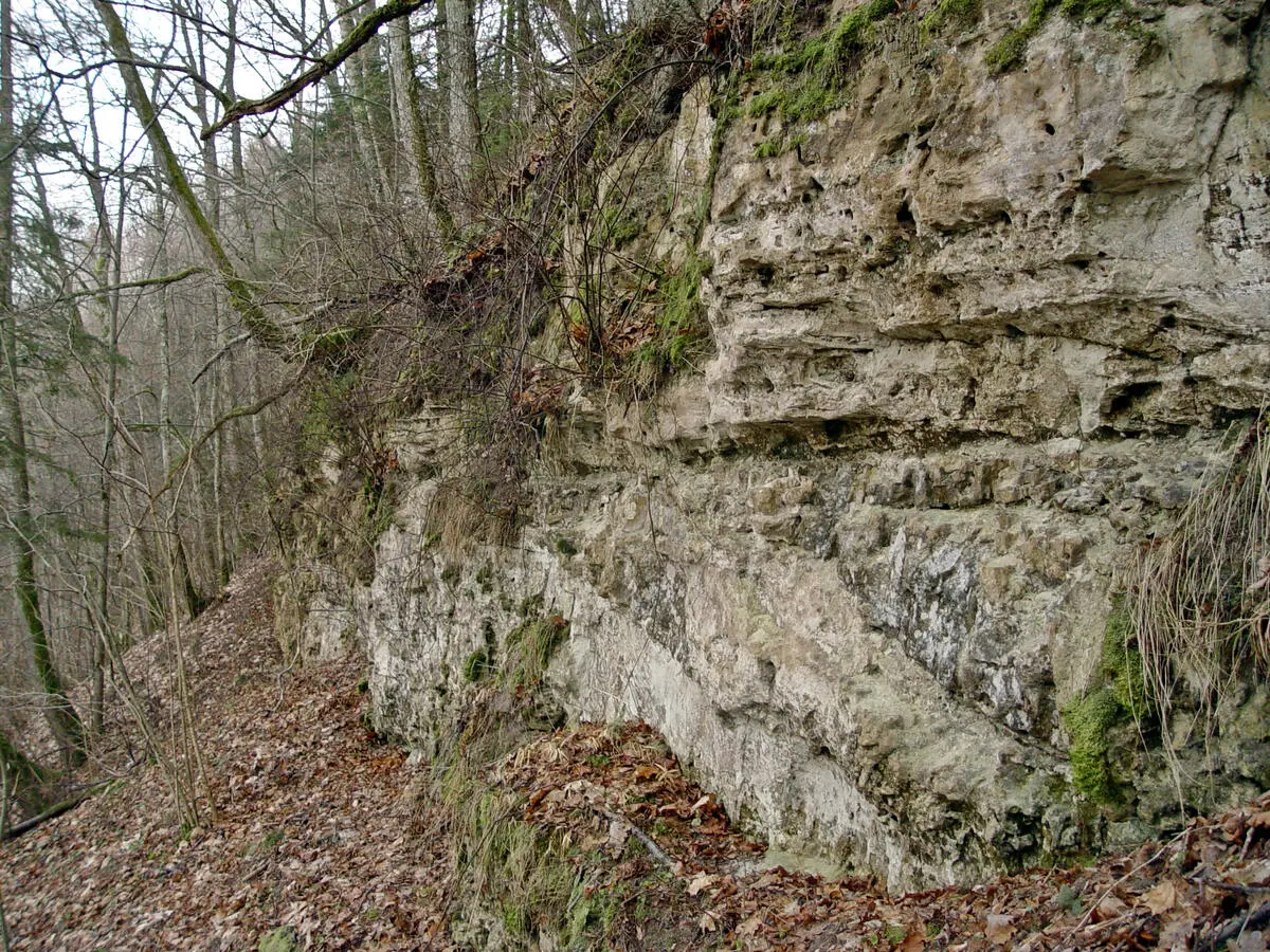 Savdabīgie Gobdziņu ridas slāņi – augšdaļā slīpslāņotais smilšakmens.. 2004. gada janvāris. / Gatis Pāvils, CC BY-SA 4.0