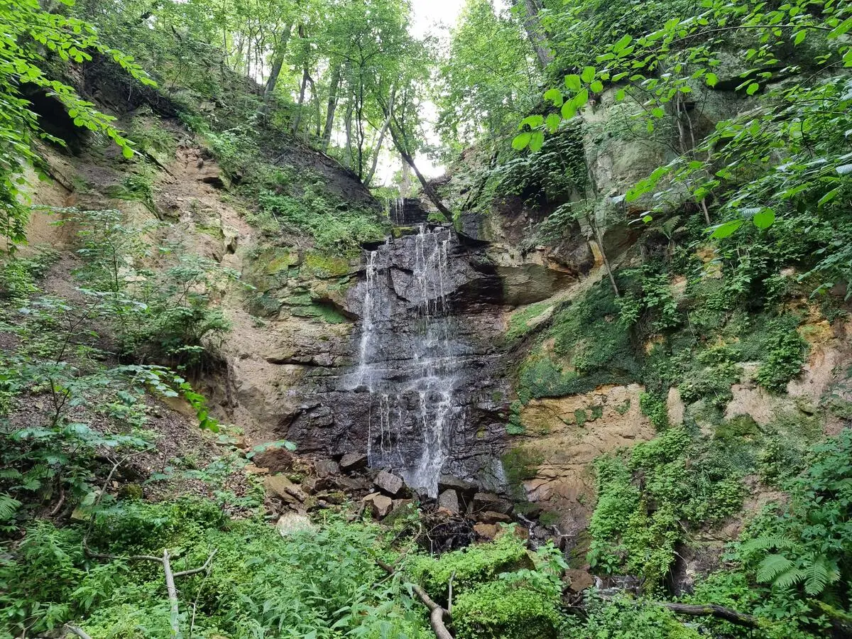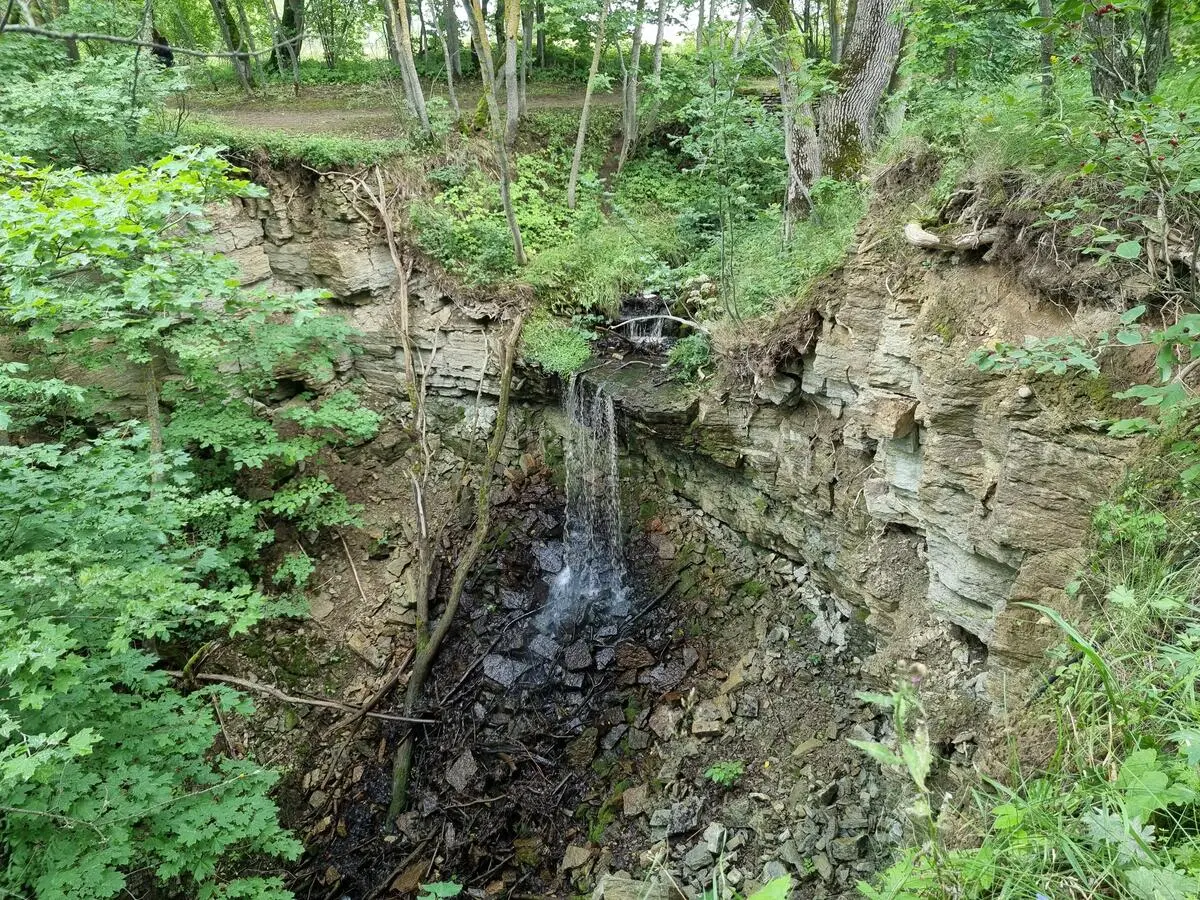 Klints mala pie Sakas muižas ir tiešām augsta – ap 48 metri, no kuriem lielākā daļa ir vertikāla klints siena. Meliorācijas grāvja ūdens šeit, netālu no Sakas muižas pils, izveidoja krāšņu ūdenskritumu.