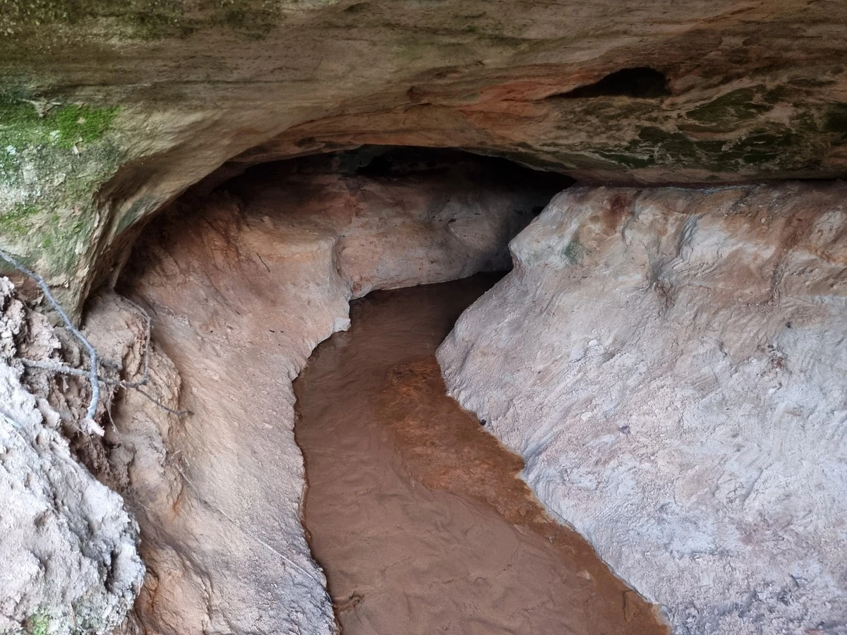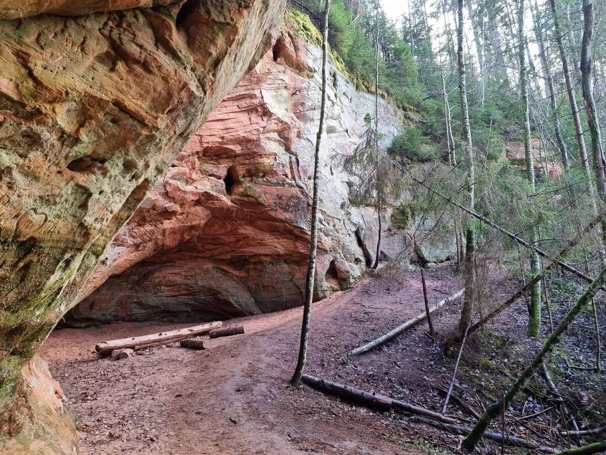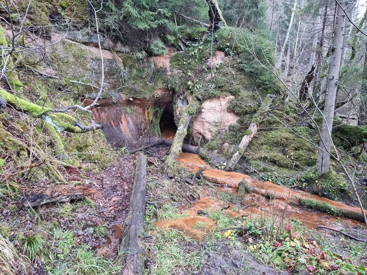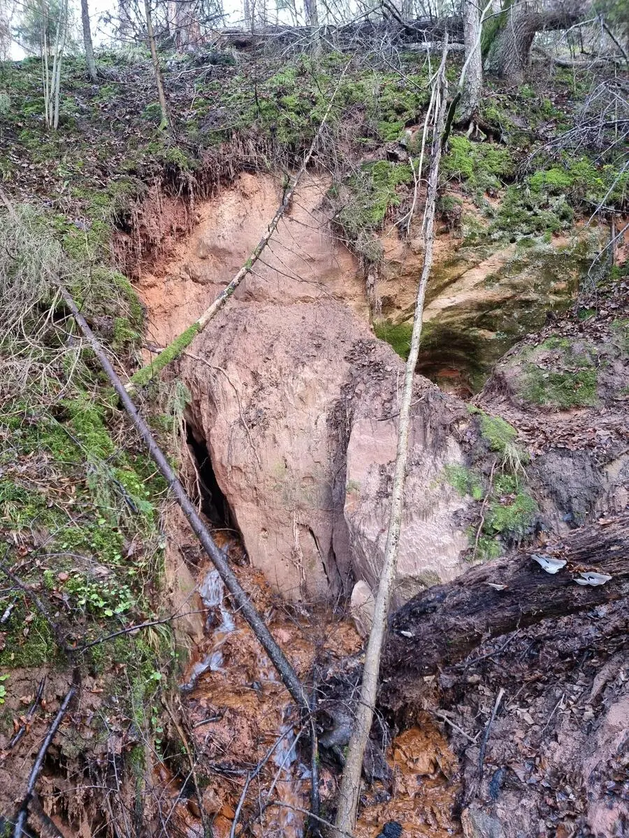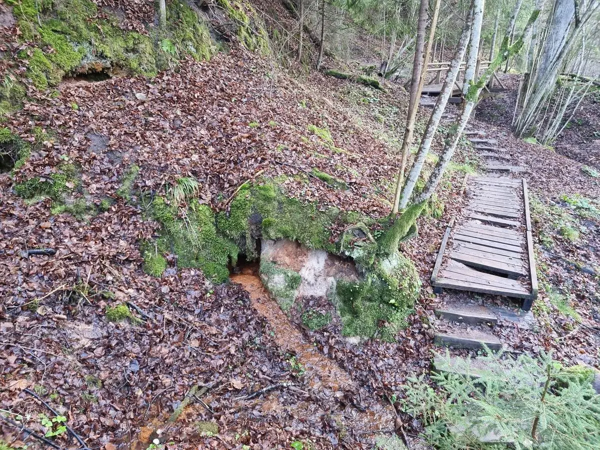 Drīz taka ved gar avotiņu, kurš iezīmē vietu, kur ap gadsimtu miju sabruka Mazā Laņģu ala, kura 1996. gadā bija ap 4,2 metrus gara.