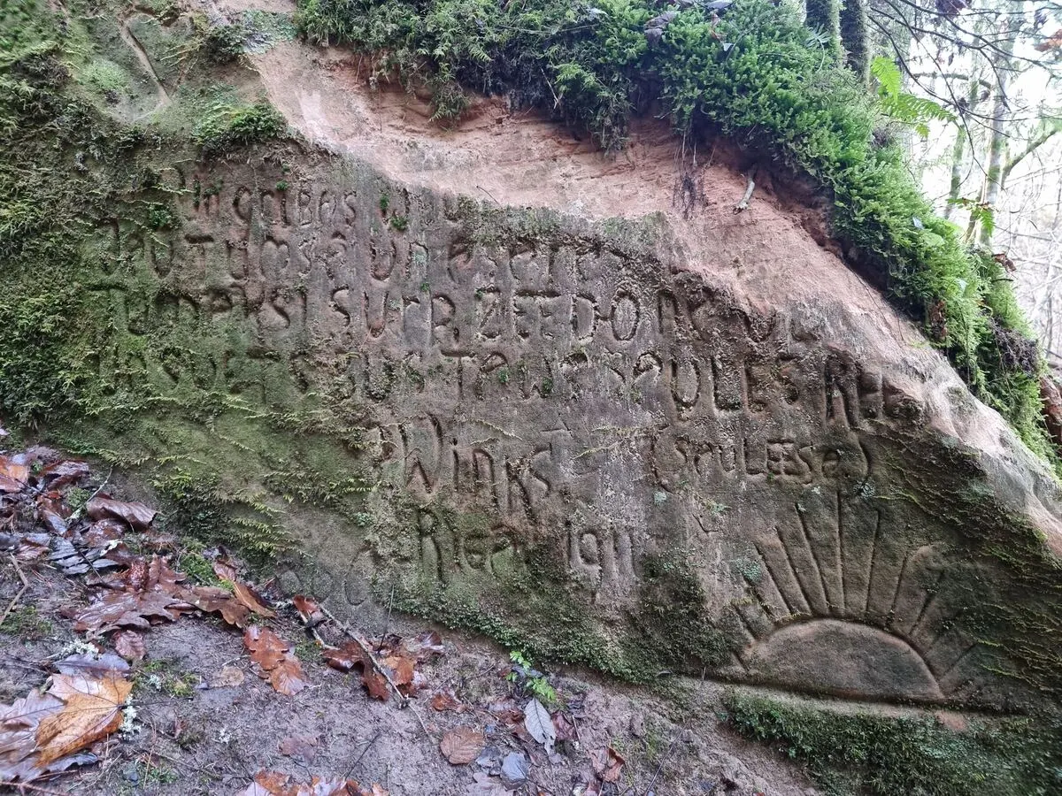 Aiz nišas klintis turpinās, tajās redzams arī lielāks, romantisks 1911. gada uzraksts.