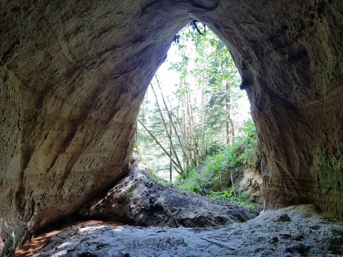 Eiropa, Latvija, Talsu novads, Ģibuļu pagasts, Abavas stāvkrasta augšmalā pie takas, kas ved uz Māras kambariem