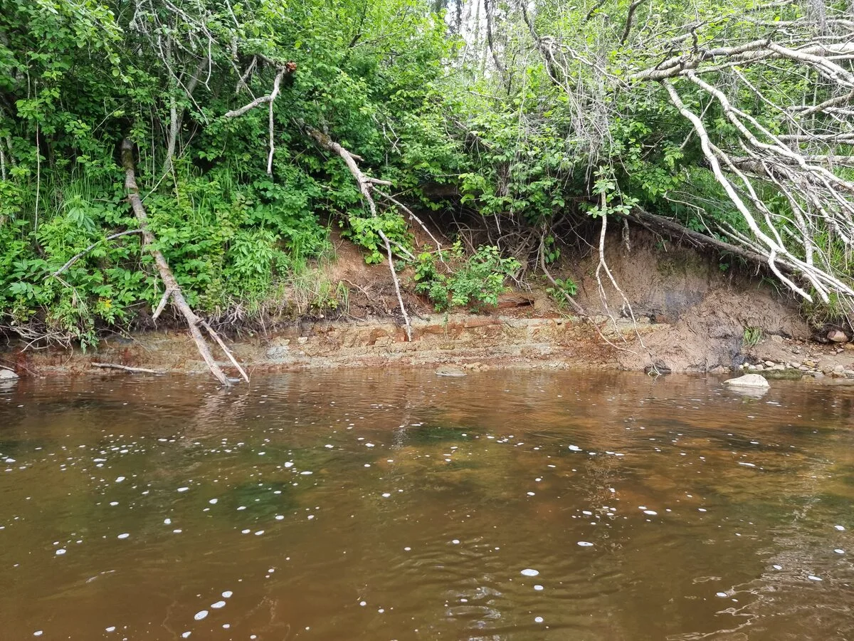 Vidējais Loša atsegums. Upes līmenī ir redzams ar juras laikmeta organiku bagāts aleirolītu slānis. 2025. gada maijs. / Gatis Pāvils, CC BY-SA 4.0