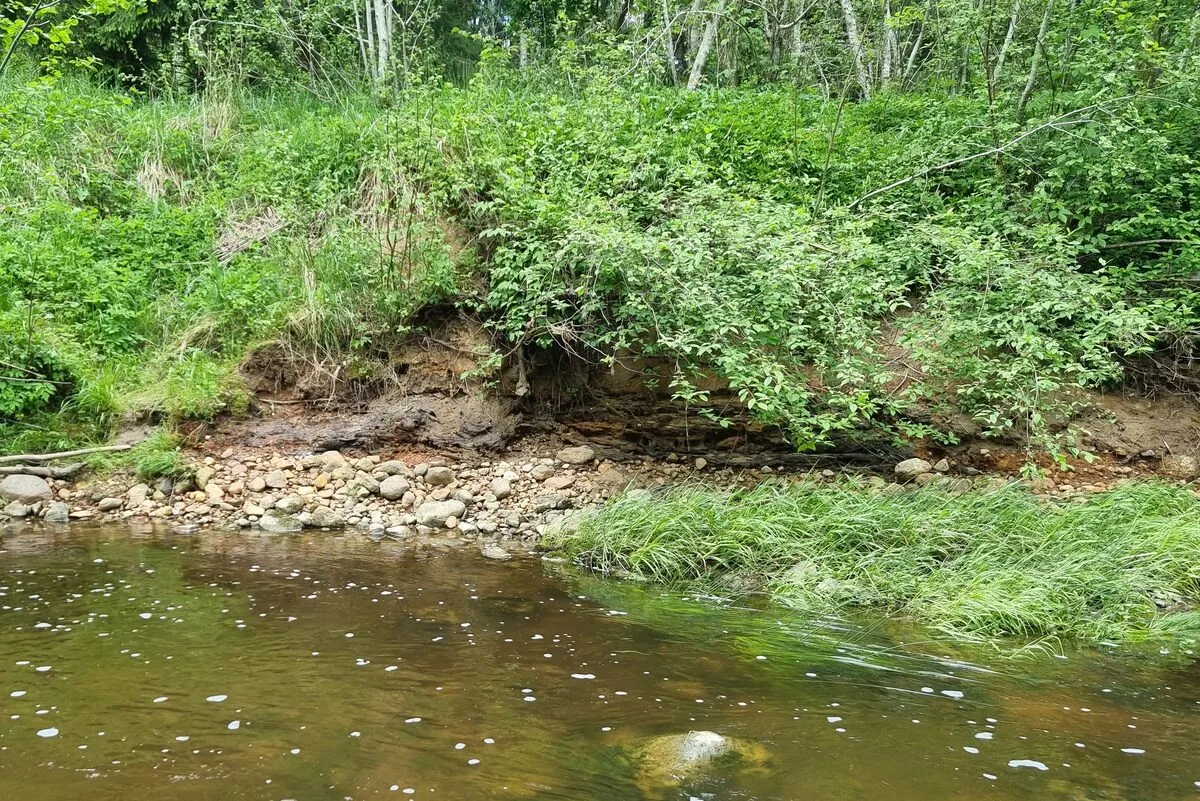 Vidējais Loša atsegums. Upes līmenī ir redzams ar juras laikmeta organiku bagāts aleirolītu slānis. 2025. gada maijs.