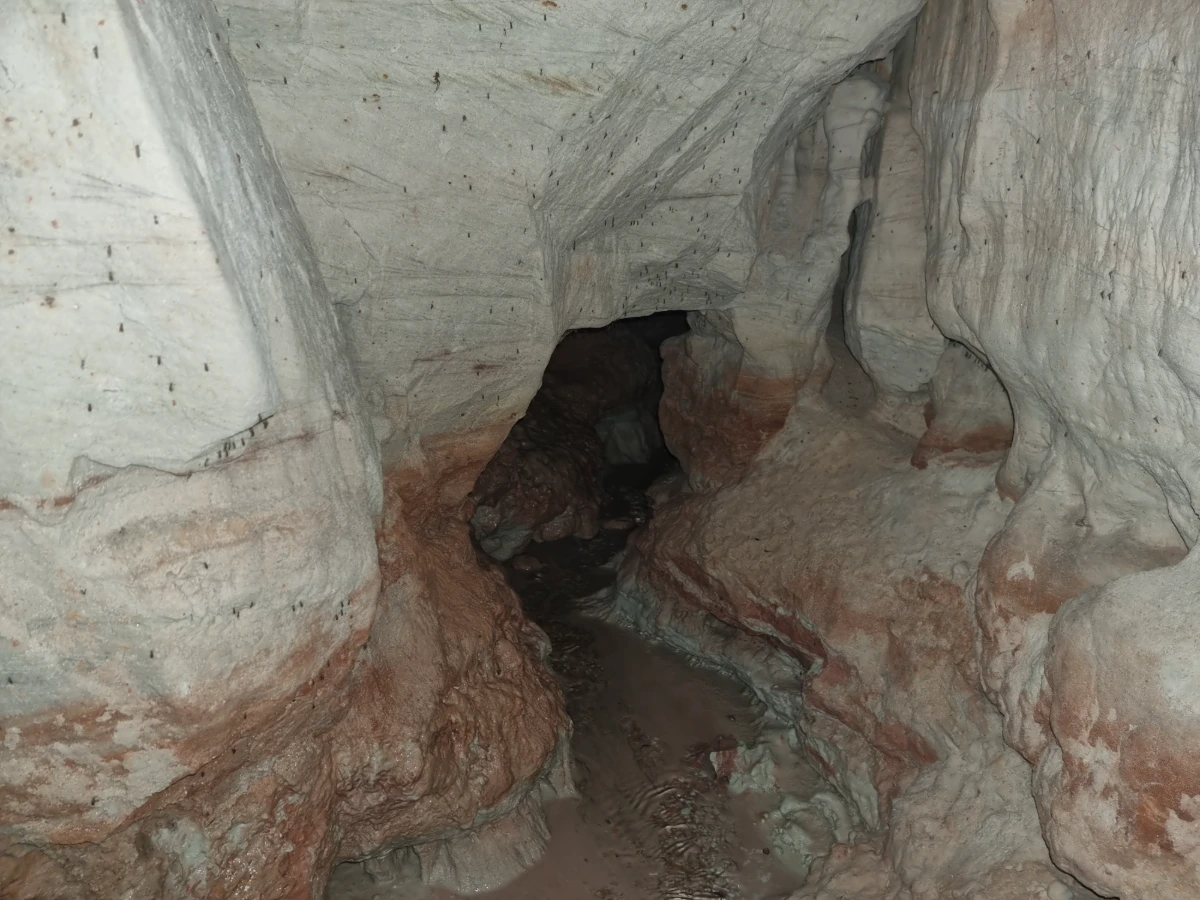 Alas iekšiene ir ievērojami plašāka – šeit atsedzas skaisti smilšakmens ieži, redzami sārti un gandrīz balti smilšakmens slāņi. Pa visu grīdas platumu plūst avots, un ala ar nelieliem līkumiem iestiepjas dziļumā.