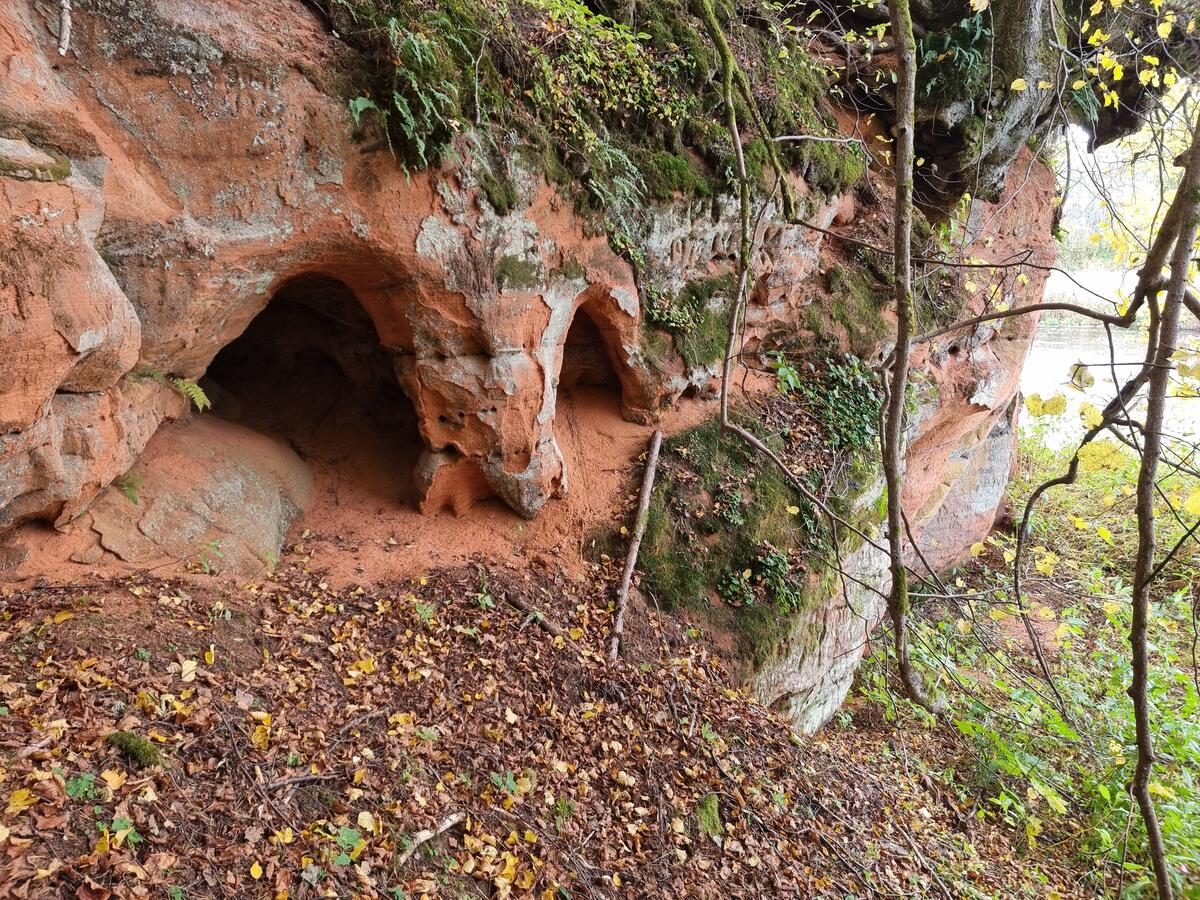 Pietraga Sarkanās klintis, sākuma daļa, nišas. 2025. gada oktobris. / Gatis Pāvils, CC BY-SA 4.0