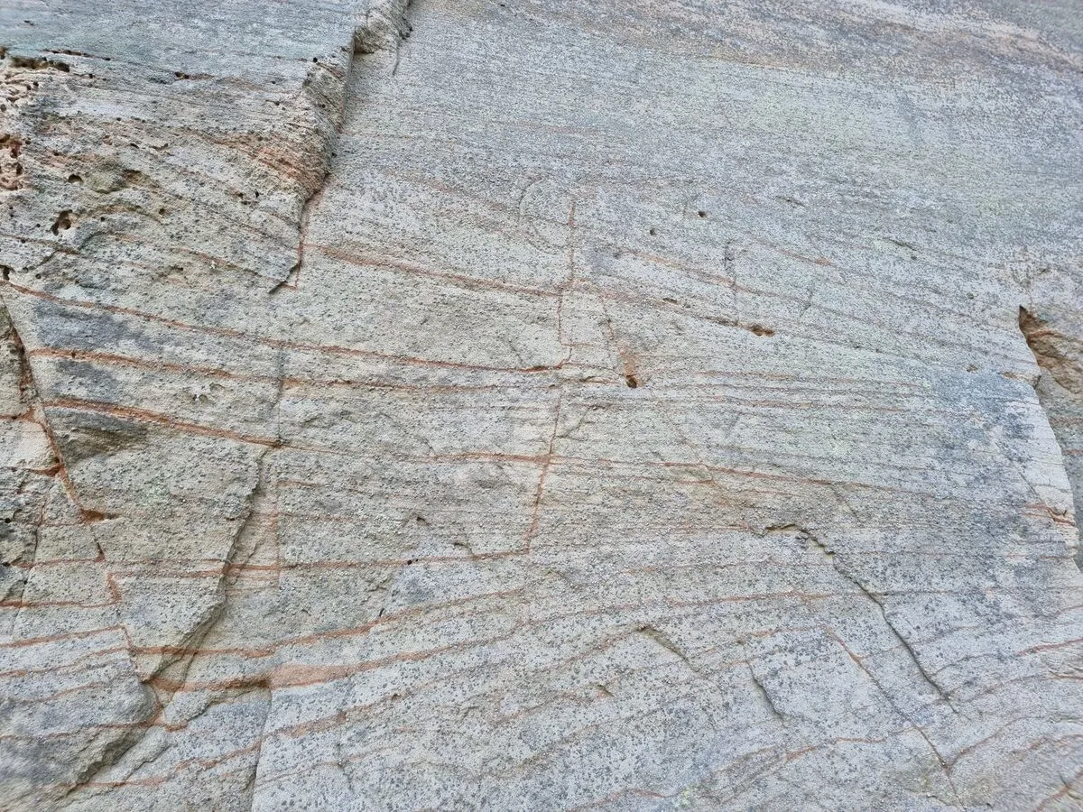 Gaujas svītas smilšakmens struktūras Ramātu klintīs – fosforīta konkrēcijas, Līzeganga joslas un sīki lūzumi. 2025. gada maijs. / Gatis Pāvils, CC BY-SA 4.0