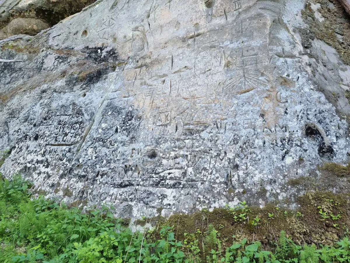 Dažādu laikmetu grafiti Ramātu klintīs. Iespējams, augstāk novietotās zīmes ir saglabājušās gadsimtiem ilgi. 2025. gada maijs.