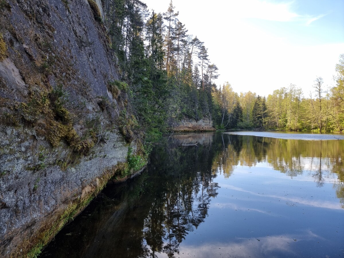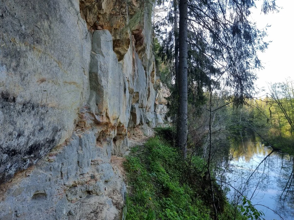 Ramātu klintis paceļas virs Gaujas vecupes. Kaut kur tālāk, paslēpusies aiz eglēm, pie ūdens līmeņa ir Spulgsūnas ala. 2025. gada maijs.