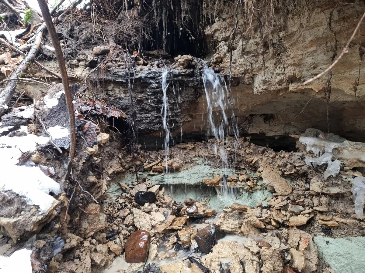 Lielu daļu gada grava ir sausa, taču brīžos, kad tajā plūst ūdens, strautiņš gravas augšdaļā veido ūdenskritumu. 2025. gada janvārī tam bija divas izteiktas pakāpes: