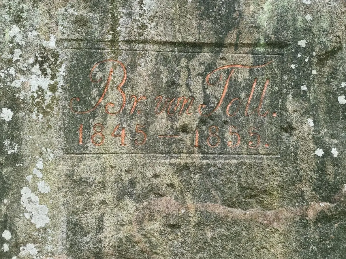 Akmenī ir iekalts uzraksts “Br. von Toll 1845–1855”. Gadskaitļi, visdrīzāk, iezīmē Ezeres parka veidošanas laika periodu. Savukārt “Br. von Toll” ir toreizējais muižas pārvaldnieks, barons fon Tolls, kuru šajā amatā bija iecēlis muižas īpašnieks Aleksandrs Štiglics. Pašam Štiglicam muižas pārvaldīšanai laika nebija – viņš kļuva par pirmo Krievijas impērijas valsts bankas pārvaldnieku un ikdienu pavadīja Pēterburgā nevis Ezerē.